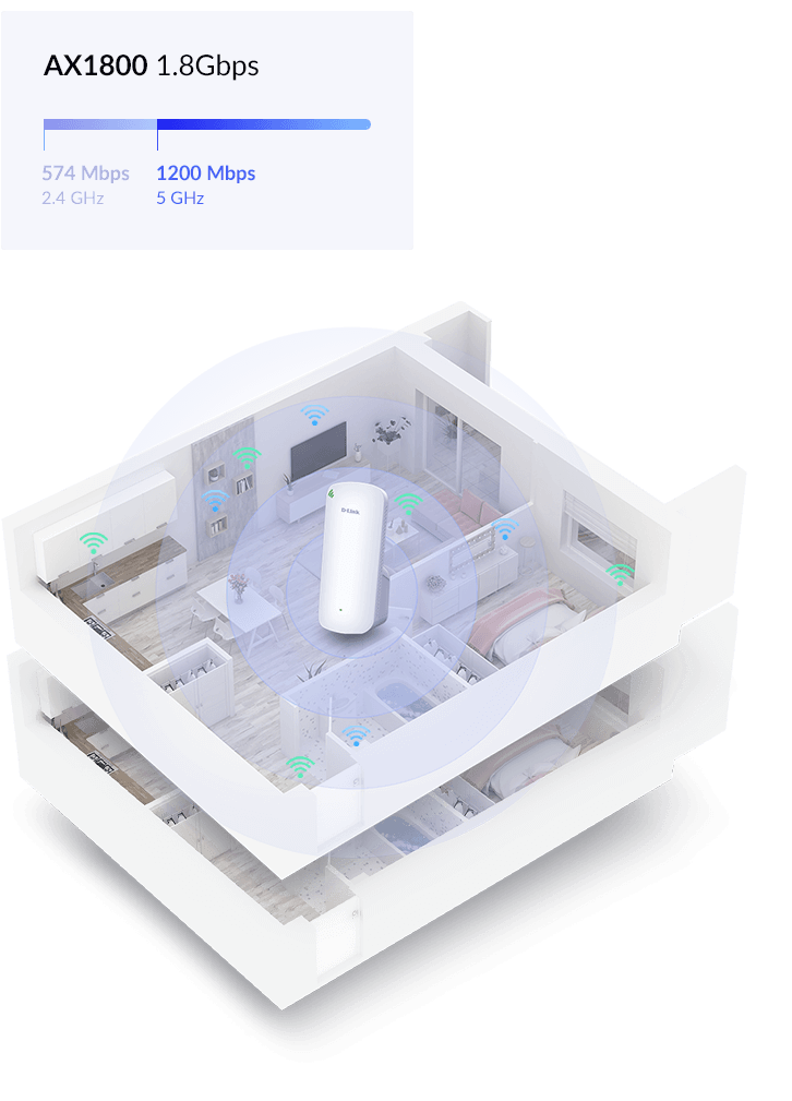 The DAP-X1860 enables you to extend your existing Wi-Fi to get an enormous coverage of up to 185 sqm, delivering next-gen Wi-Fi 6 speeds of up to 1.8 Gbps throughout every corner of your home.
