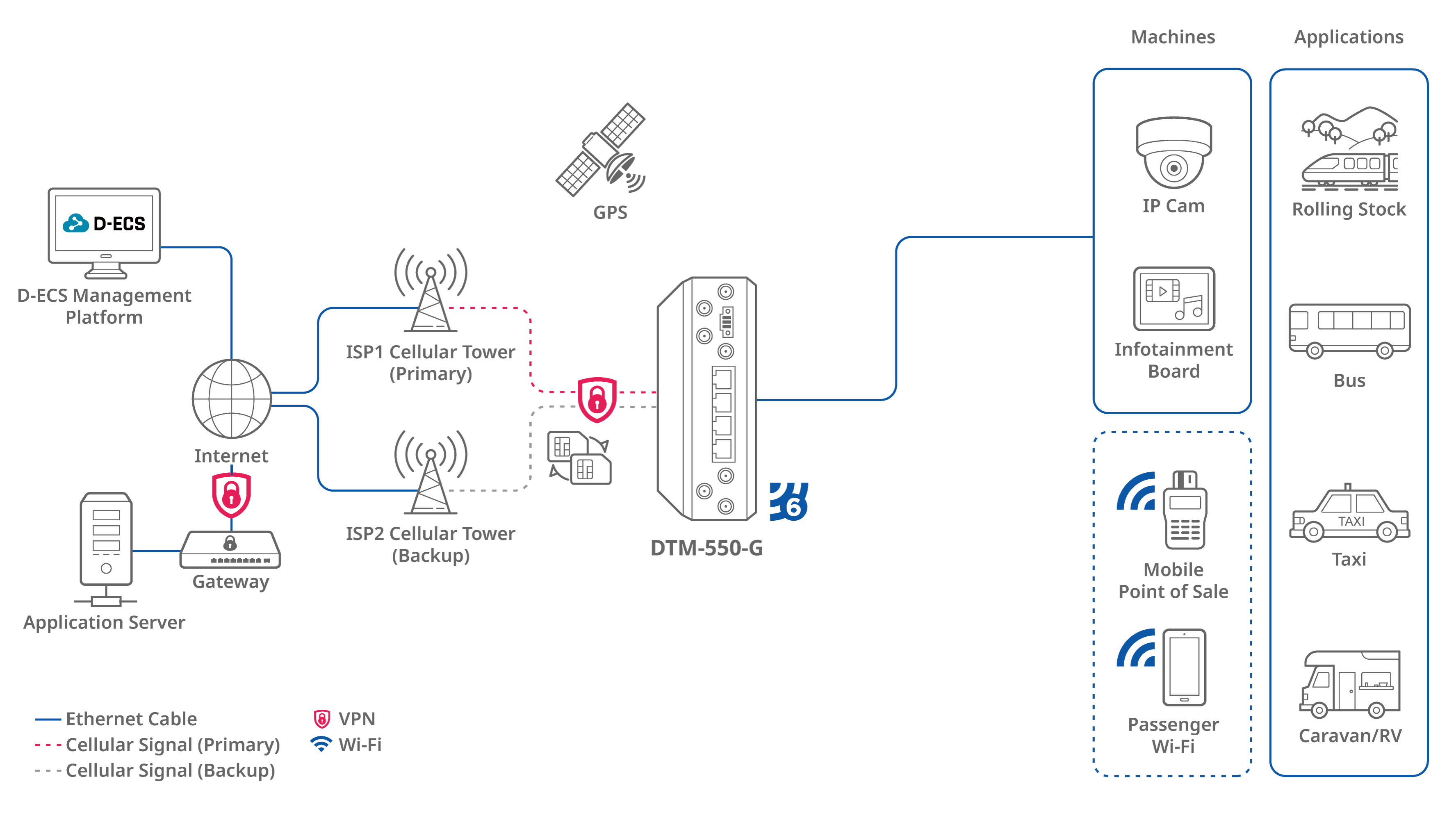The DTM-550-G 5G Transit Gateway delivers high-speed, dual-SIM cellular service and Wi-Fi 6 for robust passenger internet. Integrated GPS supports efficient route management. Managed via D-ECS for seamless remote monitoring, it’s perfect for buses, taxis, RVs and rolling stock. Supports passenger Wi-Fi, mobile POS, IP cameras, and infotainment, ensuring efficient, seamless connectivity.