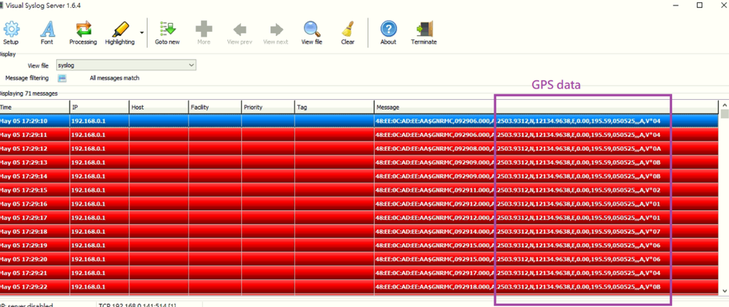 The application server collects GPS data from DTM-550-G via TCP protocol. This is the test result of GPS data collected on Visual Syslog.