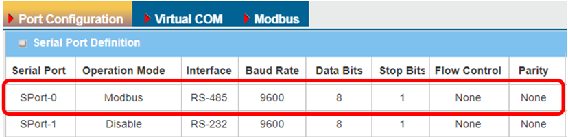 | Serial Port | Displays the SPort-0 of the RS-485 interface |