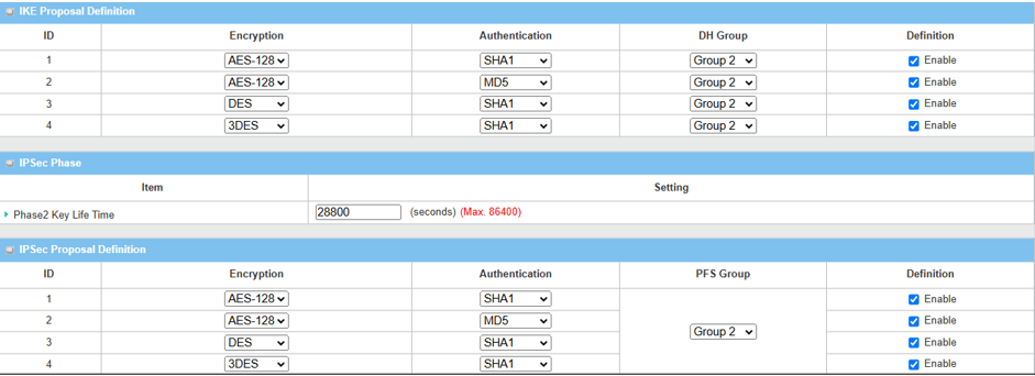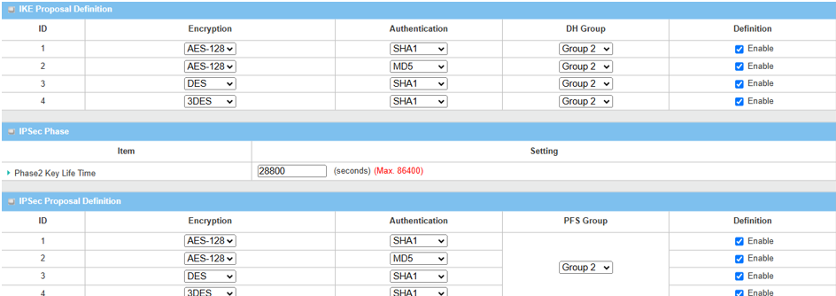 IPsec Proposal Definition Leave the Enable default setting on Web UI