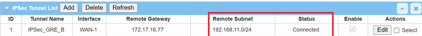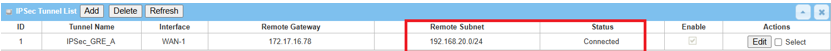 After the GRE tunnel is established, also test remote access from LAN clients by using ping <Remote LAN interface IP> or < Remote LAN device IP> within the Remote Subnet.