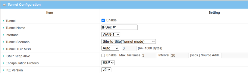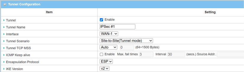 1. The Tunnel Configuration will appear, click the Enable box to enable the IPsec tunnel.