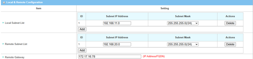Local Subnet List Specify the local subnet IP address: 192.168.11.0 and Subnet Mask: 255.55.55.0(/24) based on this scenario