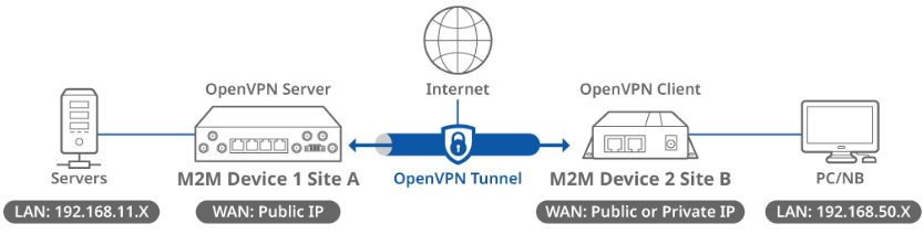This topology diagram illustrates an OpenVPN client-to-site scenario. A D-Link M2M device at Site A acts as an OpenVPN server and has a public IP address on its WAN interface, while another D-Link M2M device at Site B acts as an OpenVPN client and has either a public or private IP address on its WAN interface. Once an OpenVPN tunnel is established between the two sites, the devices in the LAN subnet (192.168.50.x) at Site B can reach the LAN subnet (192.168.11.x) at Site A.