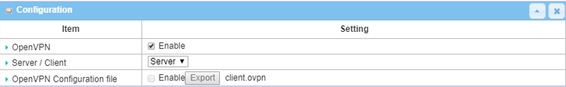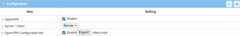 | OpenVPN Configuration File | Check the Enable box to activate the configuration export for OpenVPN client |
