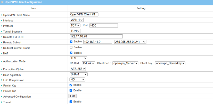Before starting OpenVPN configuration, please make sure the basic network settings of the D-Link M2M device is configured properly.