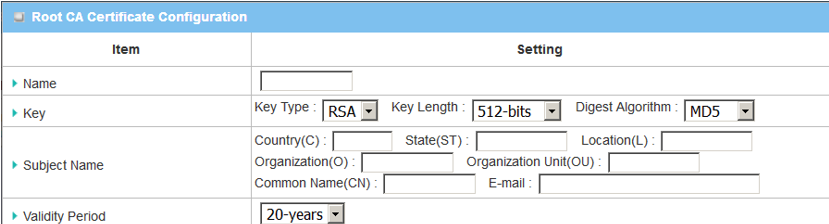 Key Type: Select RSA Key Length: Select 512-bits Digest Algorithm: Select MD5 |
