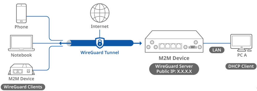 This topology diagram illustrates a WireGuard VPN scenario. A D-Link M2M device on the left side with a public IP address acts as the WireGuard server, while another D-Link M2M device, a notebook and phone on the right side act as the WireGuard clients. The WireGuard clients will obtain a virtual IP address after the WireGuard connection is established and will be able to reach PC A.