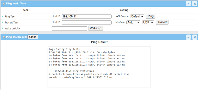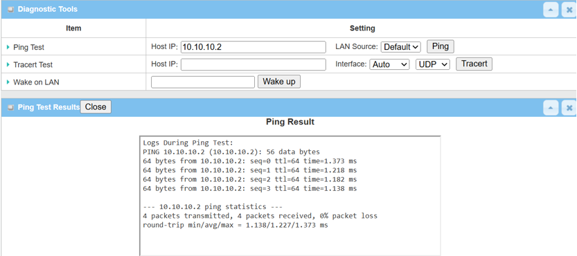 2. Enter <Remote Tunnel IP> or <Remote LAN device IP> within the remote subnet and click the Ping button to check if network traffic can pass through successfully.