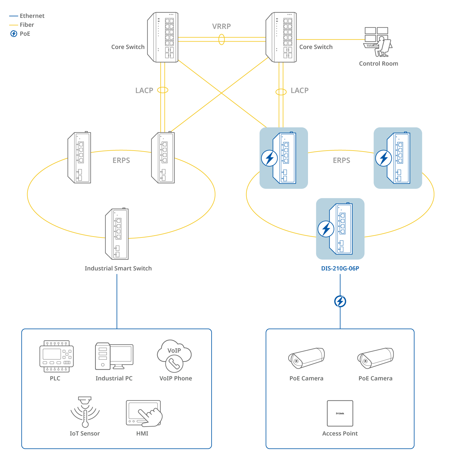 Le DIS-210G-06P combine ERPSv1/v2 et les fonctions d’Exploitation, Administration et Maintenance (OAM) pour offrir un réseau hautement résilient et facile à gérer. ERPS fournit des chemins de secours redondants, évite les boucles et permet une bascule rapide avec des temps de récupération allant jusqu’à 50 ms. Les fonctions OAM (Y.1731, 802.1ag, 802.3ah) surveillent en continu les connexions physiques et les circuits virtuels, permettant aux administrateurs réseau d’identifier rapidement les problèmes. Ensemble, ces fonctionnalités améliorent la fiabilité du réseau, réduisent les interruptions et garantissent une qualité de service constante.