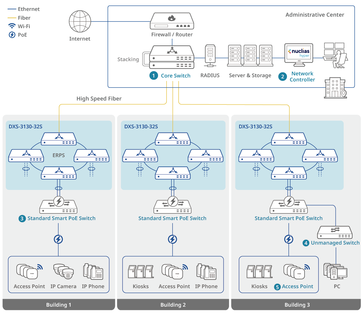 Le DXS-3130-32S garantit une disponibilité continue grâce à l’alimentation redondante et à l’empilement. Sa récupération ERPS en 50 ms minimise les interruptions, la détection de bouclage bloque les ports affectés par les tempêtes, et le VRRP assure un routage de secours transparent, ce qui en fait la solution idéale pour les hôpitaux, les usines et autres réseaux critiques.