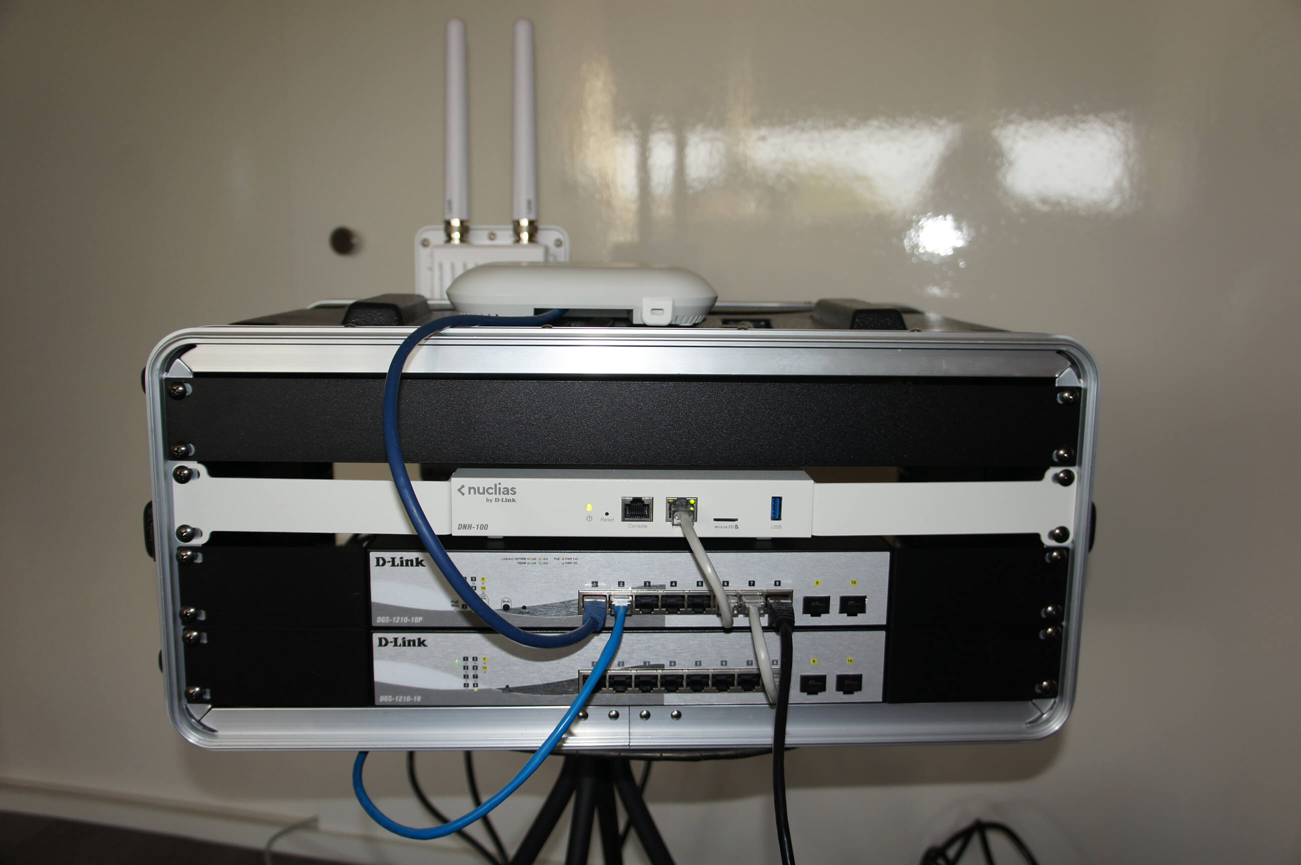 - 1x DAP-X2850: Ce point d’accès puissant a amélioré la couverture Wi-Fi dans des endroits stratégiques pendant l’événement. La technologie bibande, 4x4 MIMO, le contrôle de bande et l’équité du temps d’utilisation de l’air permettent des vitesses encore plus élevées et plus de connexions Wi-Fi.