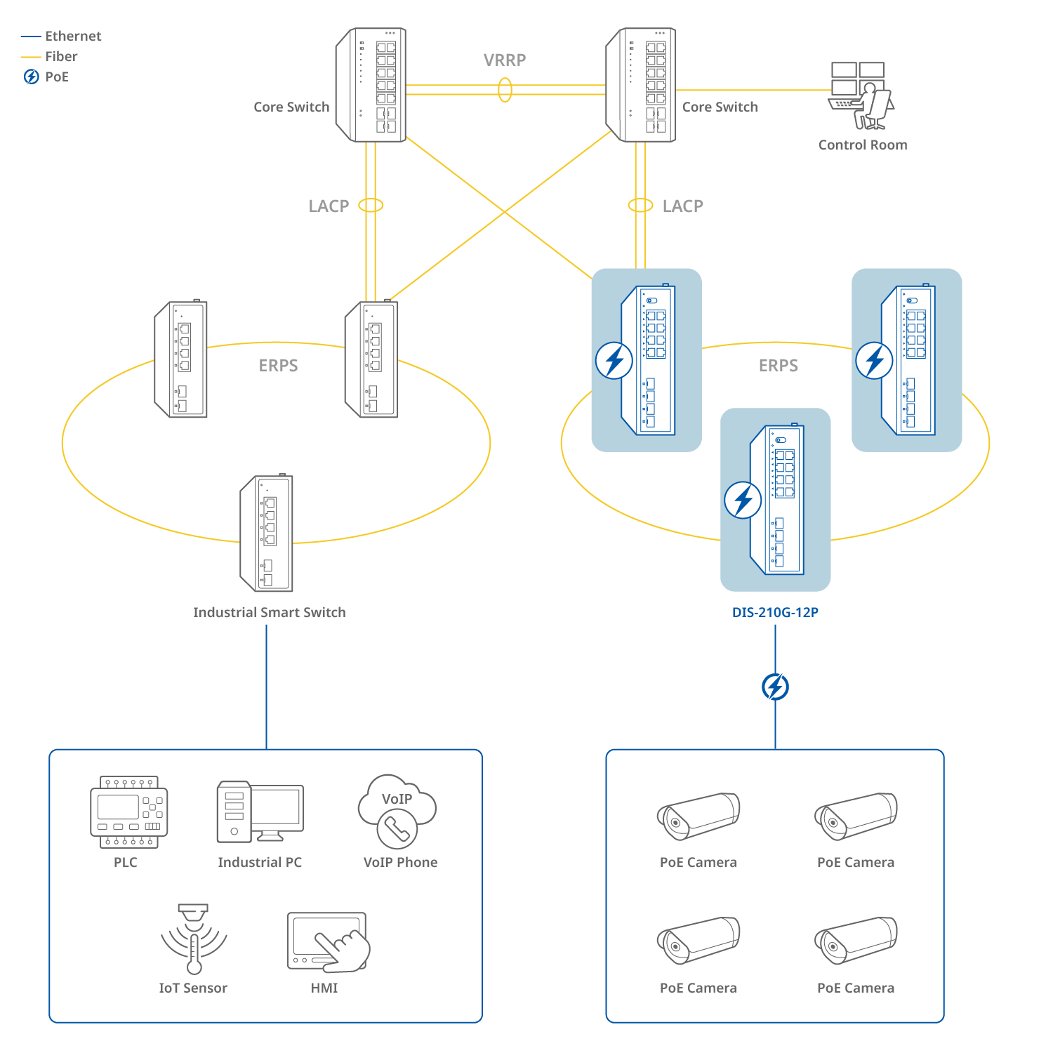 De DIS-210G-12P combineert ERPSv1/v2 met Operations, Administratie en Onderhoud (OAM) voor een uiterst robuust en eenvoudig te beheren netwerk. ERPS biedt redundante back-uppaden, voorkomt lussen en maakt snelle failover mogelijk met hersteltijden tot 50 ms. OAM-functies (Y.1731, 802.1ag, 802.3ah) bewaken continu fysieke verbindingen en virtuele circuits, zodat netwerkbeheerders problemen snel kunnen identificeren. Samen verbeteren deze functies de netwerkbetrouwbaarheid, minimaliseren ze uitvaltijd en garanderen ze een consistente servicekwaliteit.