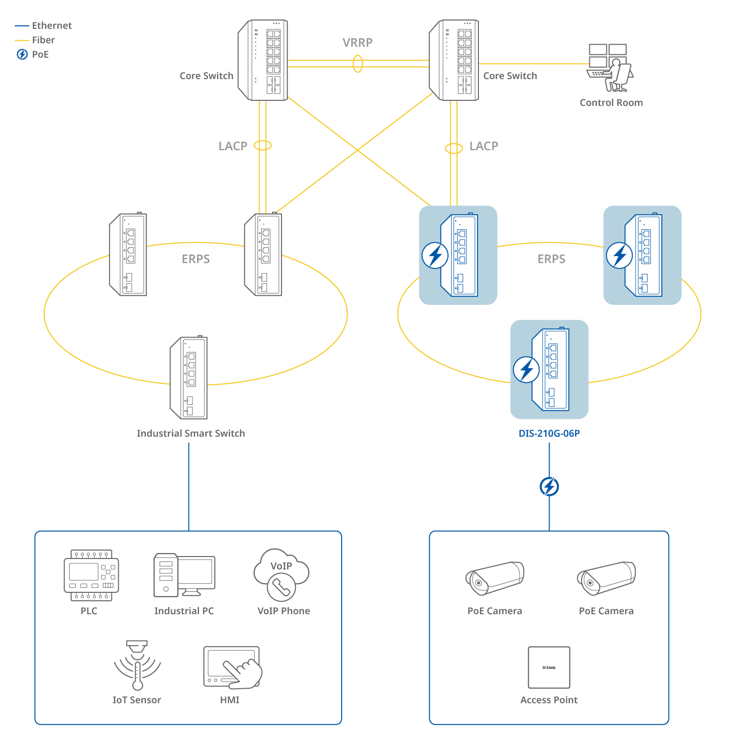 The DIS-210G-06P is an industrial smart switch equipped with four 1G ports and two 1G SFP ports for network management and aggregation. With a total power budget of up to 120W, each port can supply up to 30W. The SFP ports support long-distance data transmission, rapid failover redundancy, and throughput aggregation. The DIS-210G-06P supports ERPS and static routing, which reduces latency, enables effective traffic control, and improves network scalability and efficiency.