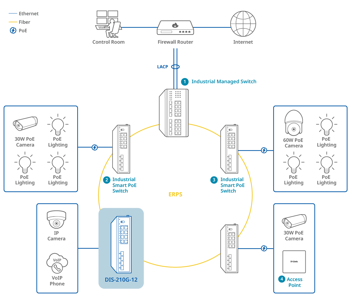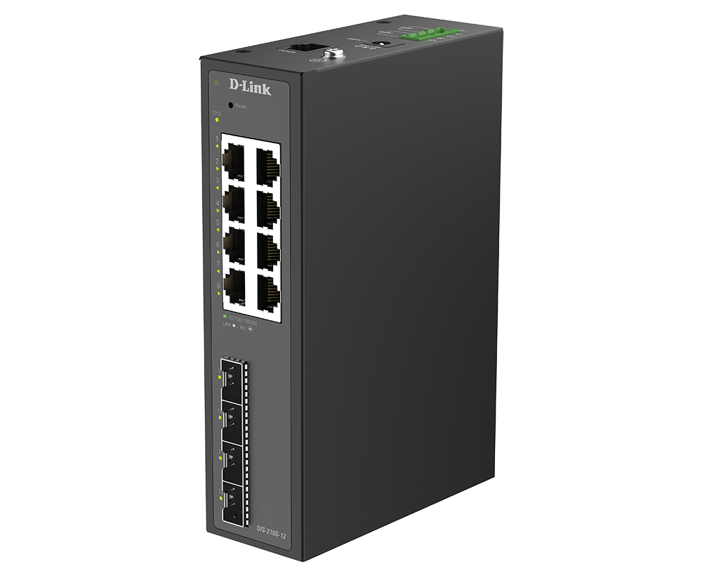The DIS-210G-12 is an industrial smart switch equipped with eight 1G ports and four 1G SFP ports for network management and aggregation. The SFP ports support long-distance data transmission, rapid failover redundancy, and throughput aggregation. The DIS-210G-12 supports ERPS and static routing, which reduces latency, enables effective traffic control, and improves network scalability and efficiency.