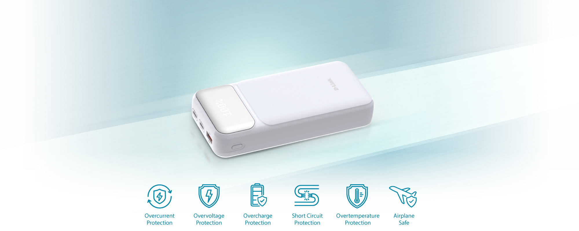 The DPP-201 power bank features built-in protection against overcurrent, overvoltage, overcharge, and short circuits, automatically shutting off to keep your devices safe. It also meets ICAO regulations, making it airplane-safe and perfect for powering your tech with confidence at home or in transit.