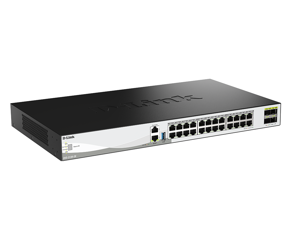 Scale your network with the DXS-3130-28 by stacking up to 9 switches into a single physical or virtual unit. This simplifies management, improves redundancy, and allows control of the entire stack through one IP address. With up to 200 Gbps, physical stacking boosts capacity to meet growing network demands.