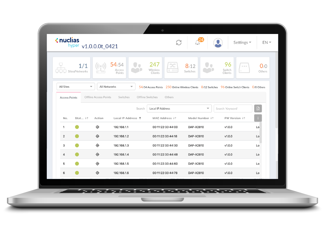 Nuclias Hyper (DNC-5000) is a software-based controller network management solution that can be deployed on-premises, with no additional licensing cost. It simplifies the management of large-scale business networks across multiple locations by providing centralized control of up to 2,000 managed devices, including core, aggregation, and edge switches, as well as access points (APs).