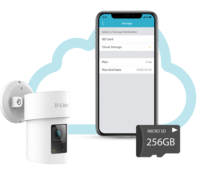 The DCS-8620LH lets you record snapshots and video clips to the Cloud for anytime access. Play back recordings from the Cloud or download footage to your mobile device from anywhere, anytime. Alternatively, store your footage directly to a microSD card. With support for a whopping 256 GB you can save days-on-end of footage. It also cleverly records over your old footage, leaving you with one less thing to worry about.
