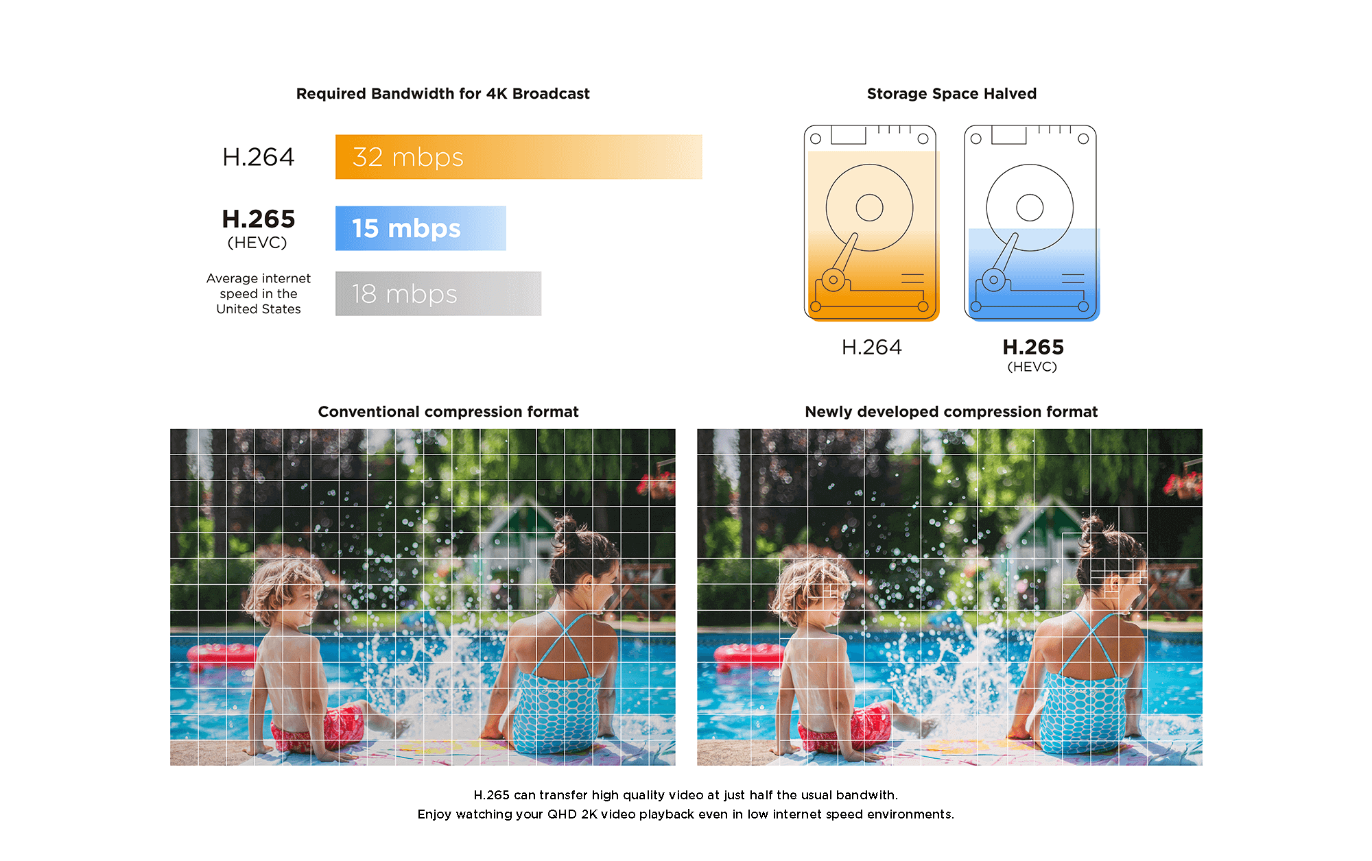The latest industry standard allows for higher quality video recording, longer recording time and massively reduced bandwidth and storage consumption.