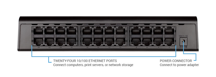 The DES-1024A 24-Port 10/100 Switch offers an economical way for SOHO and small to medium businesses (SMB) to benefit from fast speed networking. It provides sixteen ports for easy expansion of your network and a quick way to upgrade your network to Fast Ethernet connectivity.