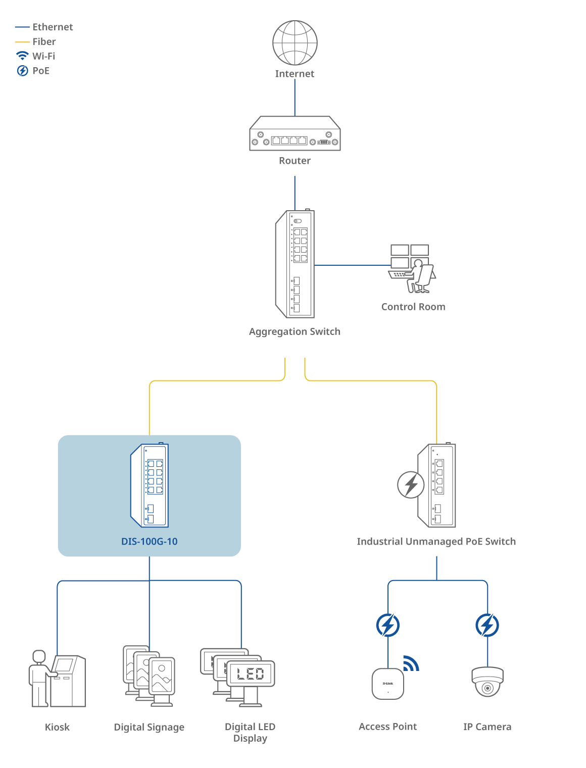 The DIS-100G-10 features two SFP ports that enable flexible, long-distance fiber connections, perfect for extending your network across remote sites or between buildings. Fiber optic cabling goes beyond the distance limitations of traditional Ethernet, offering high bandwidth and strong resistance to interference. This ensures stable, high-performance transmission in industrial environments where reliability is essential.