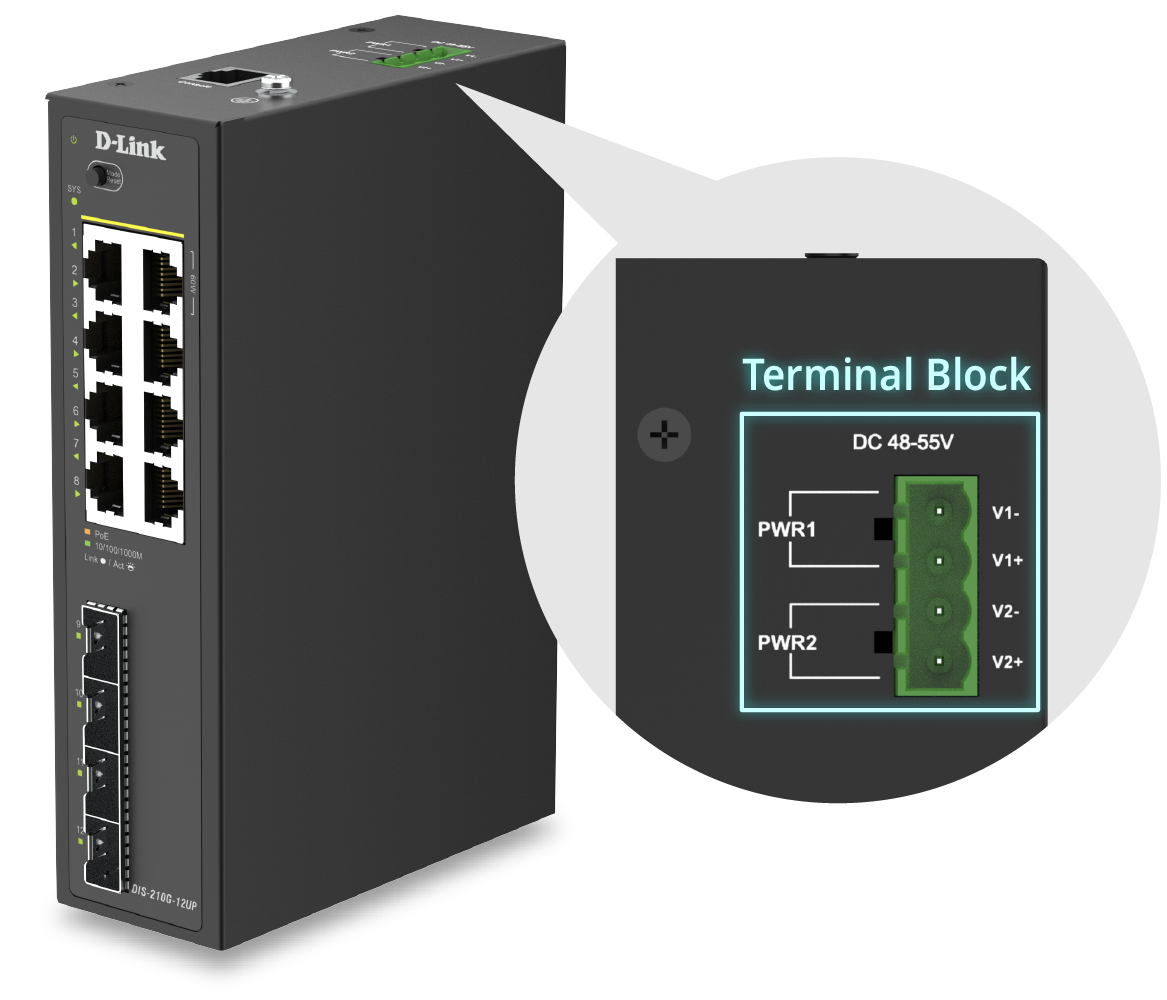 The DIS-210G-12UP is equipped with eight PoE ports compliant with IEEE 802.3af/at/bt standards, delivering both data and power through a single Ethernet cable.