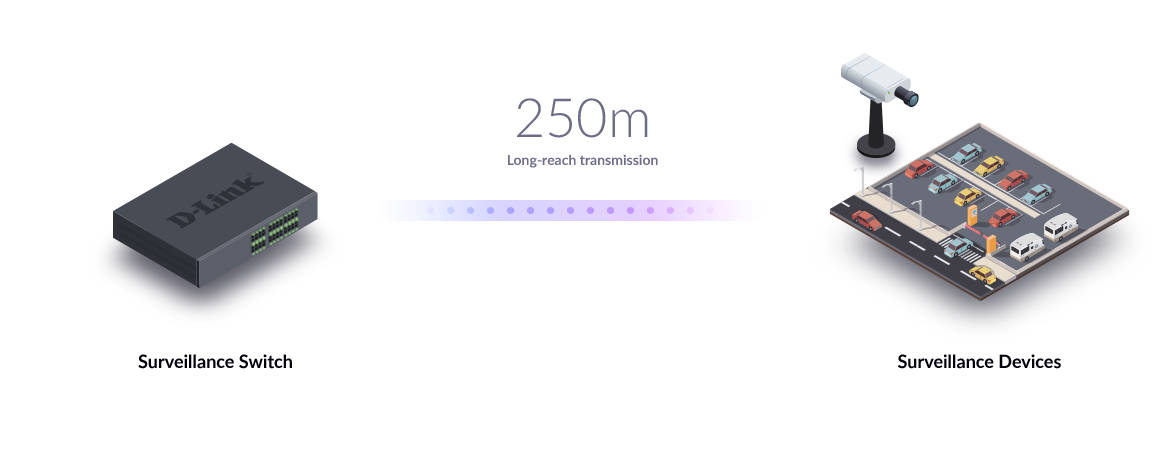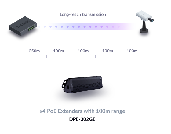1 Compatible with a wide selection of D-Link PoE-enabled cameras. Please check with your local D-Link customer service for more information. Up to 250 metres connectivity may be affected by cabling quality. We recommend customers to test compatibility before actual physical deployment.