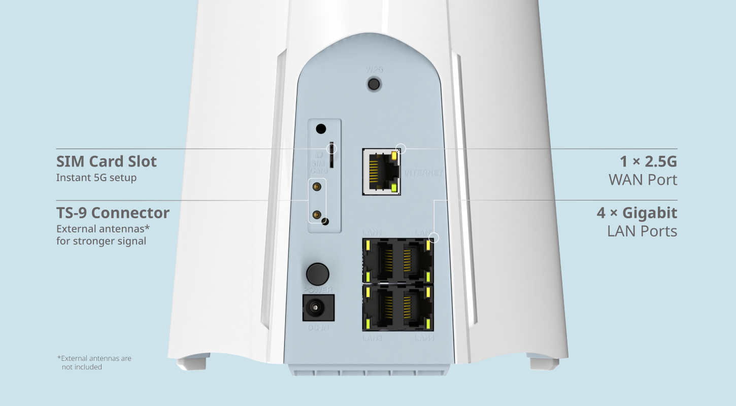 4 x Gigabit Ethernet LAN ports 1 x 2.5 Gigabit Ethernet WAN port 1 x SIM card slot |