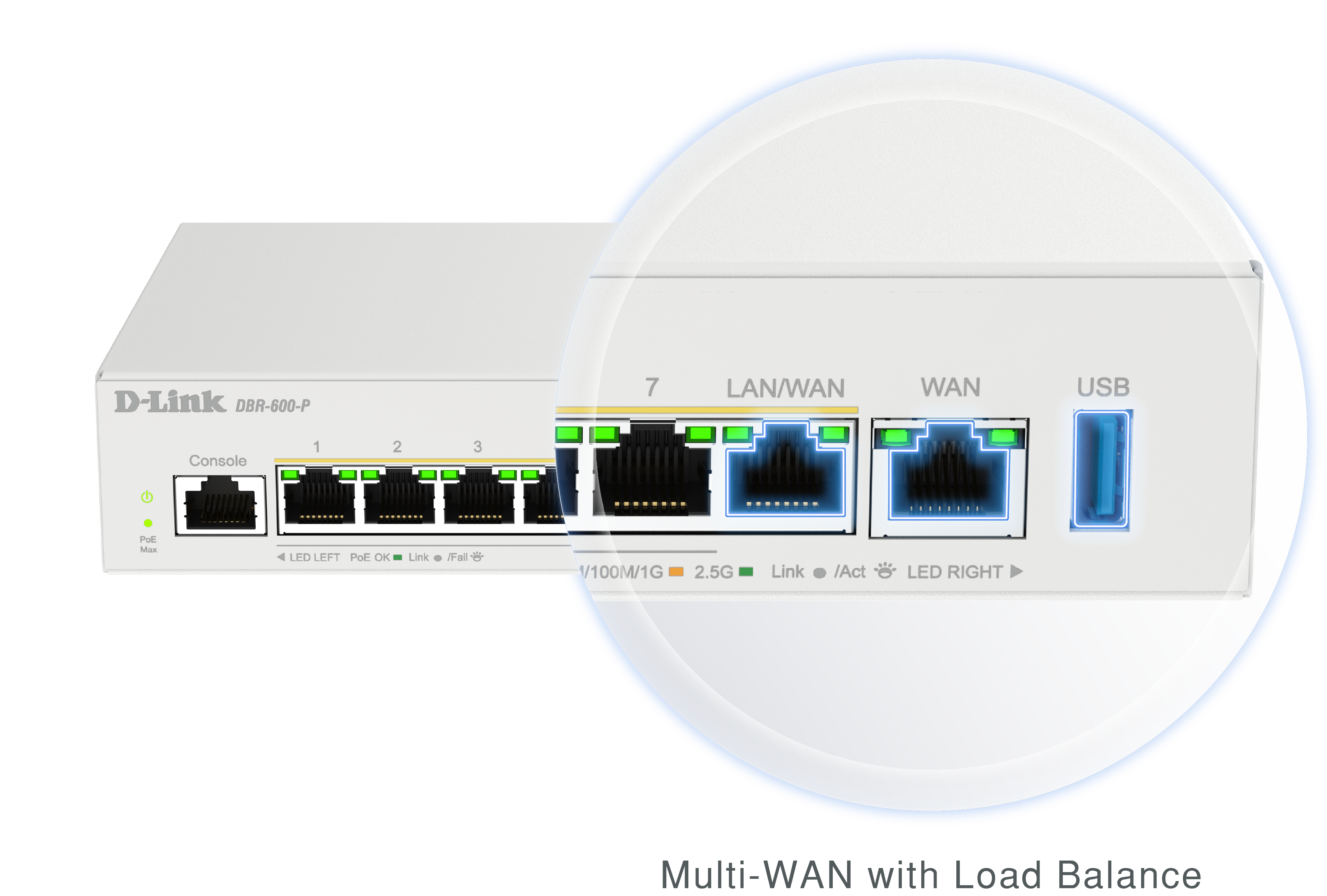 With up to 3 WAN ports, the DBR-600-P stays connected even if your primary connection goes down—automatic failover seamlessly switches to a backup. Load balancing distributes network traffic across multiple WAN connections, ensuring reliable performance and optimized traffic flow to