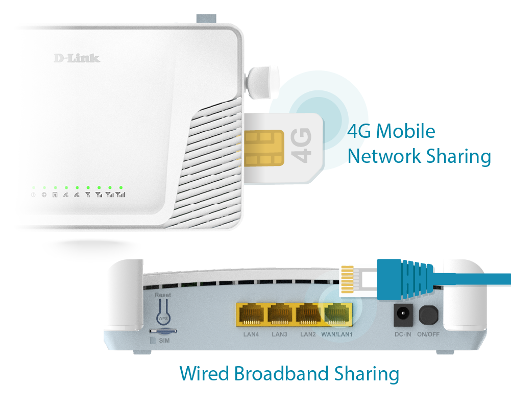¹The theoretical coverage in D-Link Lab testing may vary in different environments. Maximum wireless signal rate derived from IEEE 802.11ax specifications. Network conditions and environmental factors, including volume of network traffic, building materials and construction, and network overhead, lower actual data throughput rate. Environmental factors may adversely affect wireless signal range. An 802.11ax client device is required to achieve maximum speeds and performance. All references to speed and range are for comparison purposes only.²Mobile broadband speeds will vary and are dependent on a range of factors including network configuration, network capacity, signal strength, and the conditions of your mobile broadband subscription.³SIM card and service plan not included.
