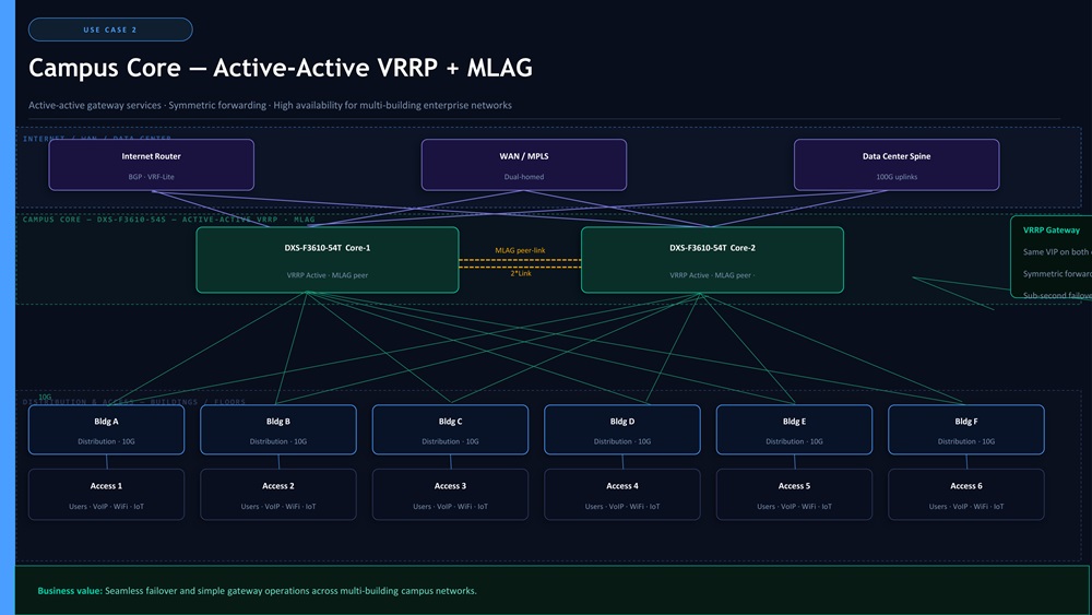 Overview: Campus core delivering active-active gateway services with symmetric forwarding and high availability for multi-building enterprise networks.