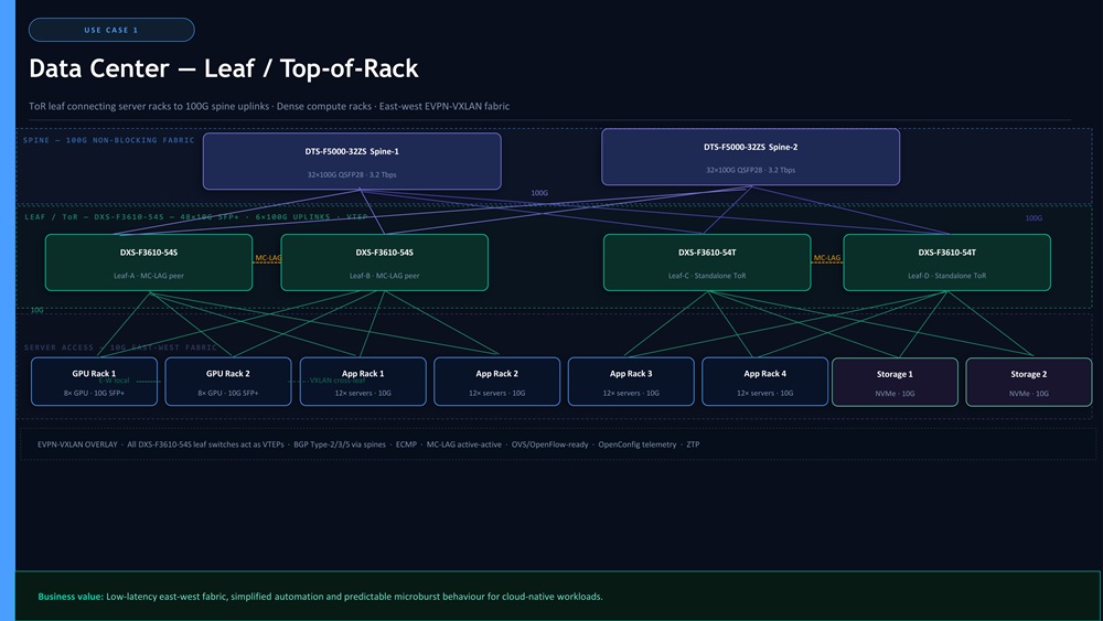 Overview: ToR leaf connecting server racks to 100G spine uplinks. Ideal for dense compute racks and east-west application traffic within an EVPN-VXLAN fabric.