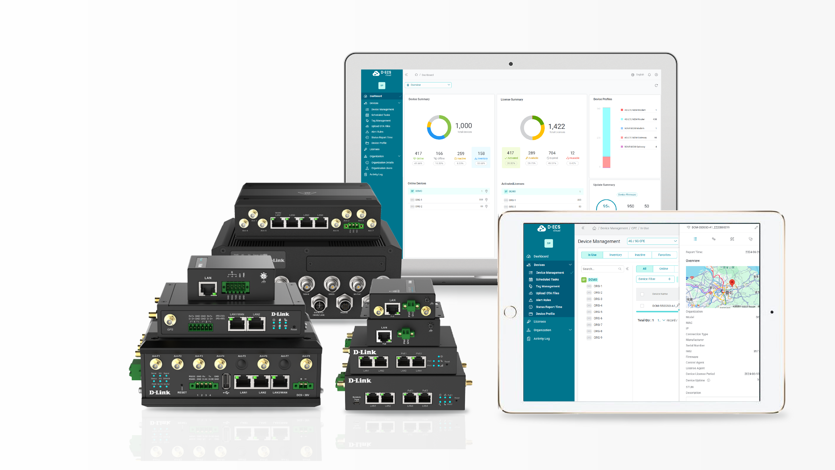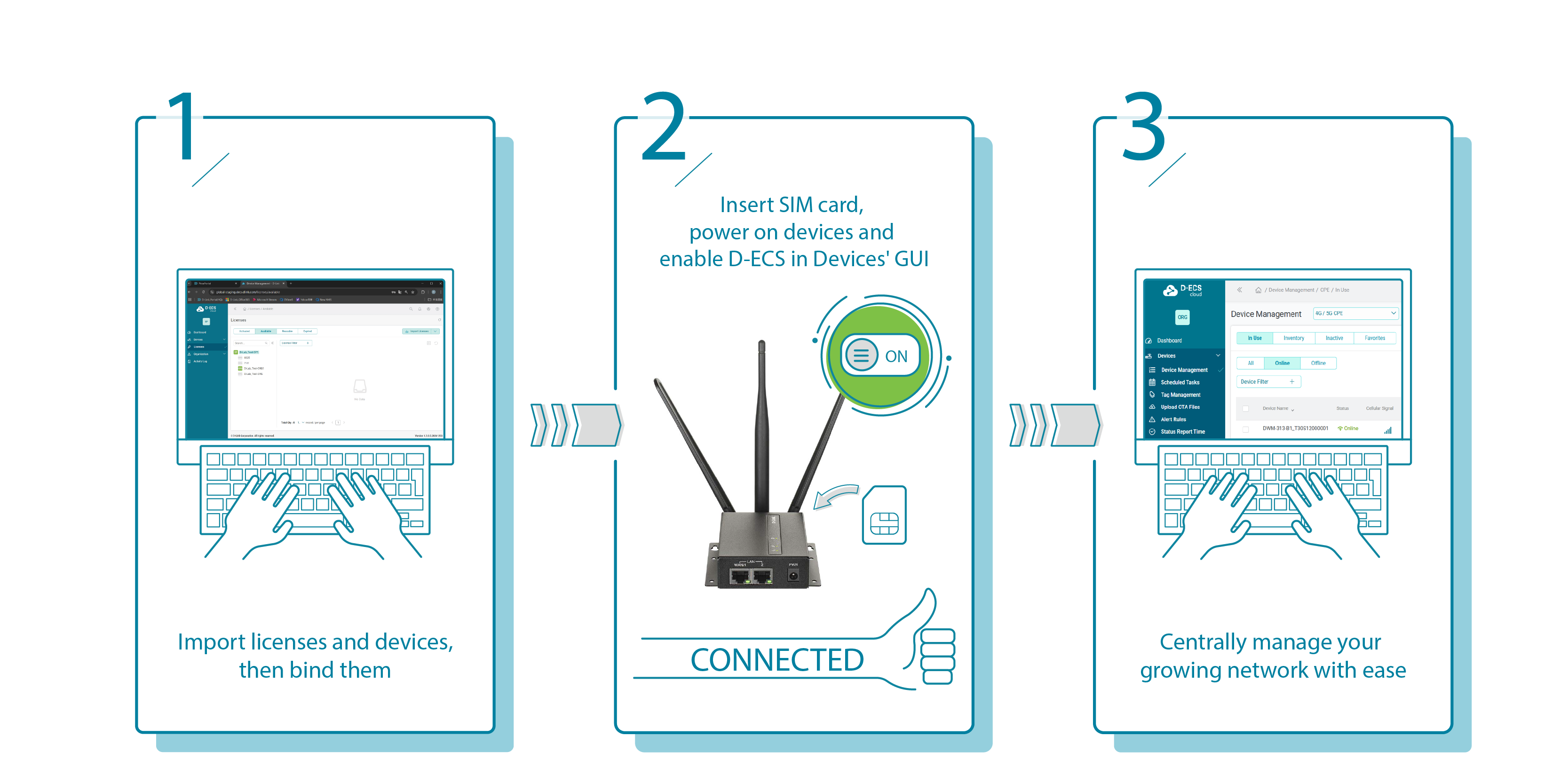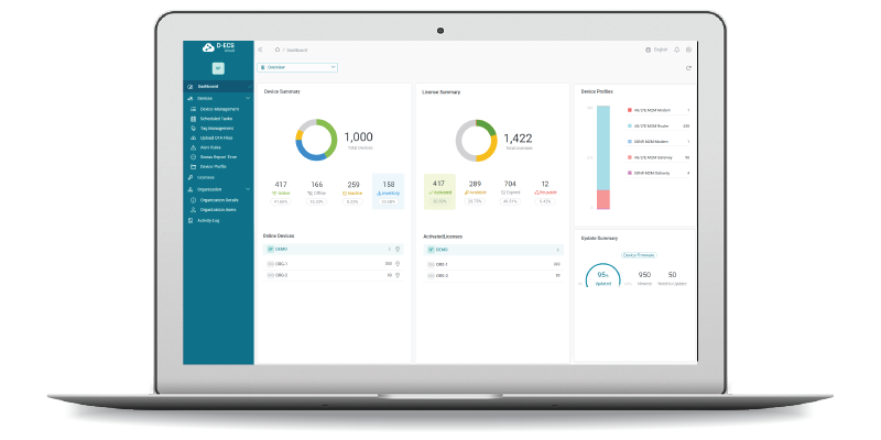 Gestire e supportare da remoto i dispositivi M2M non dovrebbe essere complicato. Con D-ECS, la piattaforma basata sul cloud di D-Link, puoi gestire, monitorare e risolvere i problemi dei tuoi dispositivi M2M 4G/5G in qualsiasi momento e ovunque, senza bisogno di configurazioni complesse per l'accesso remoto. Semplifica le operazioni, riduci i tempi di inattività e migliora il servizio clienti senza sforzi.