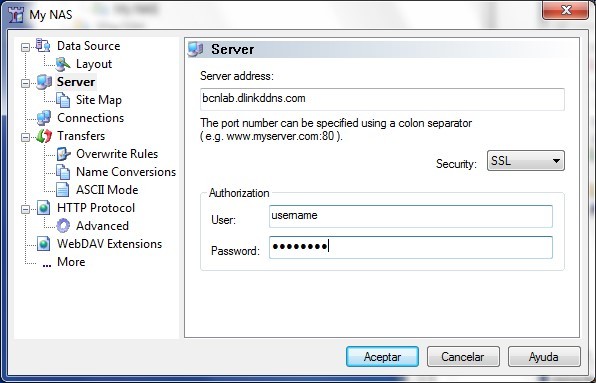 - In the new window that appears, in the server address, type the IP or hostname you use to connect to your DNS-320