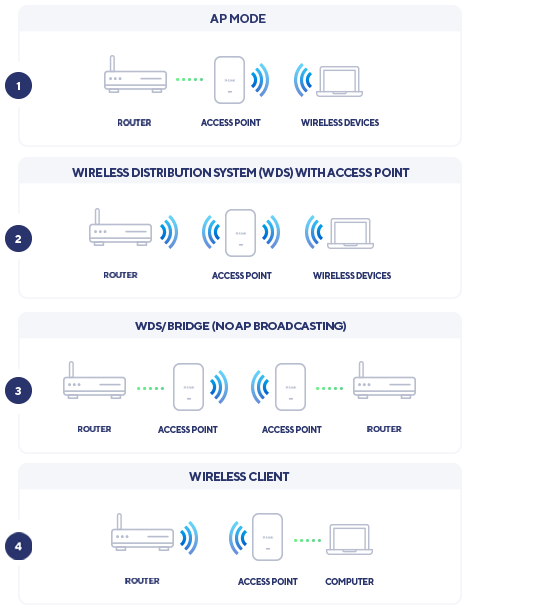 Use as an access point (AP), Wireless Distribution System (SDS), WDS with AP, wireless client, wireless repeater, WISP client router or WISP repeater.