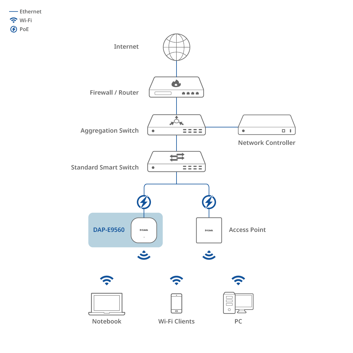 DAP-E9560 is designed for ultra-fast, secure, and efficient wireless connectivity to meet the demands of modern high-density environments. With Tri-band support, 320 MHz channels, 4096-QAM, and 10G Ethernet, it delivers exceptional performance for latency-sensitive applications like video conferencing, cloud access, and real-time collaboration.