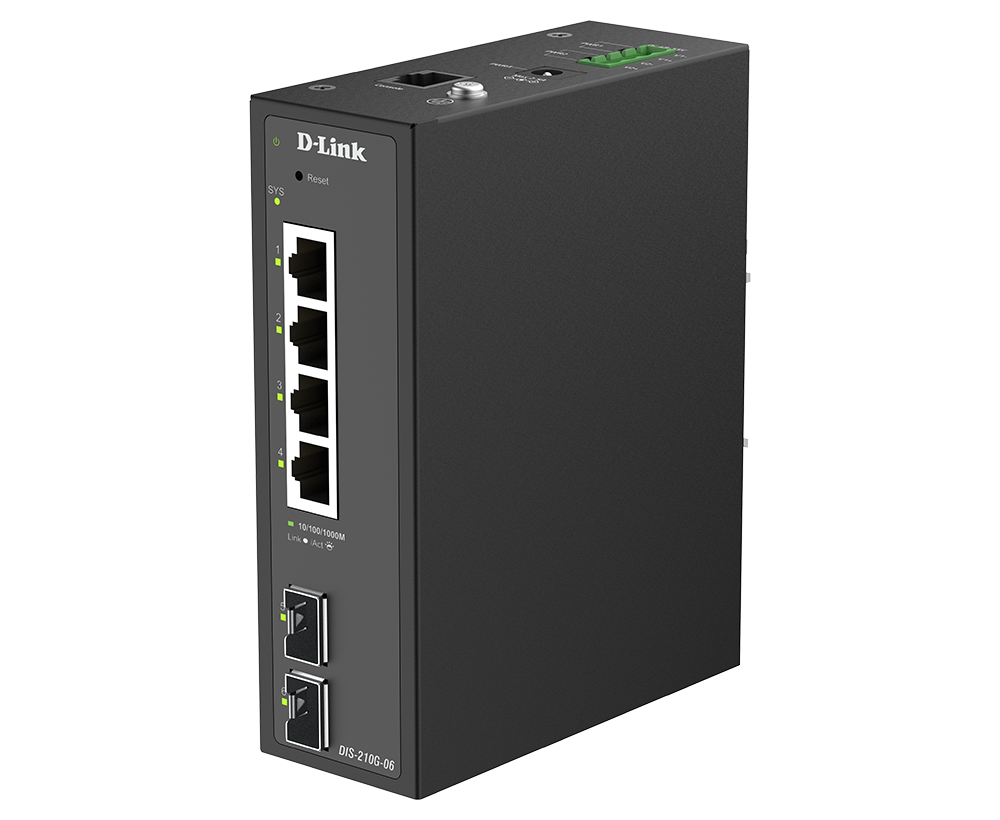 The DIS-210G-06 is an industrial smart switch equipped with four 1G ports and two 1G SFP ports for network management and aggregation. The SFP ports support long-distance data transmission, rapid failover redundancy, and throughput aggregation. The DIS-210G-06 supports ERPS and static routing, which reduces latency, enables effective traffic control, and improves network scalability and efficiency.