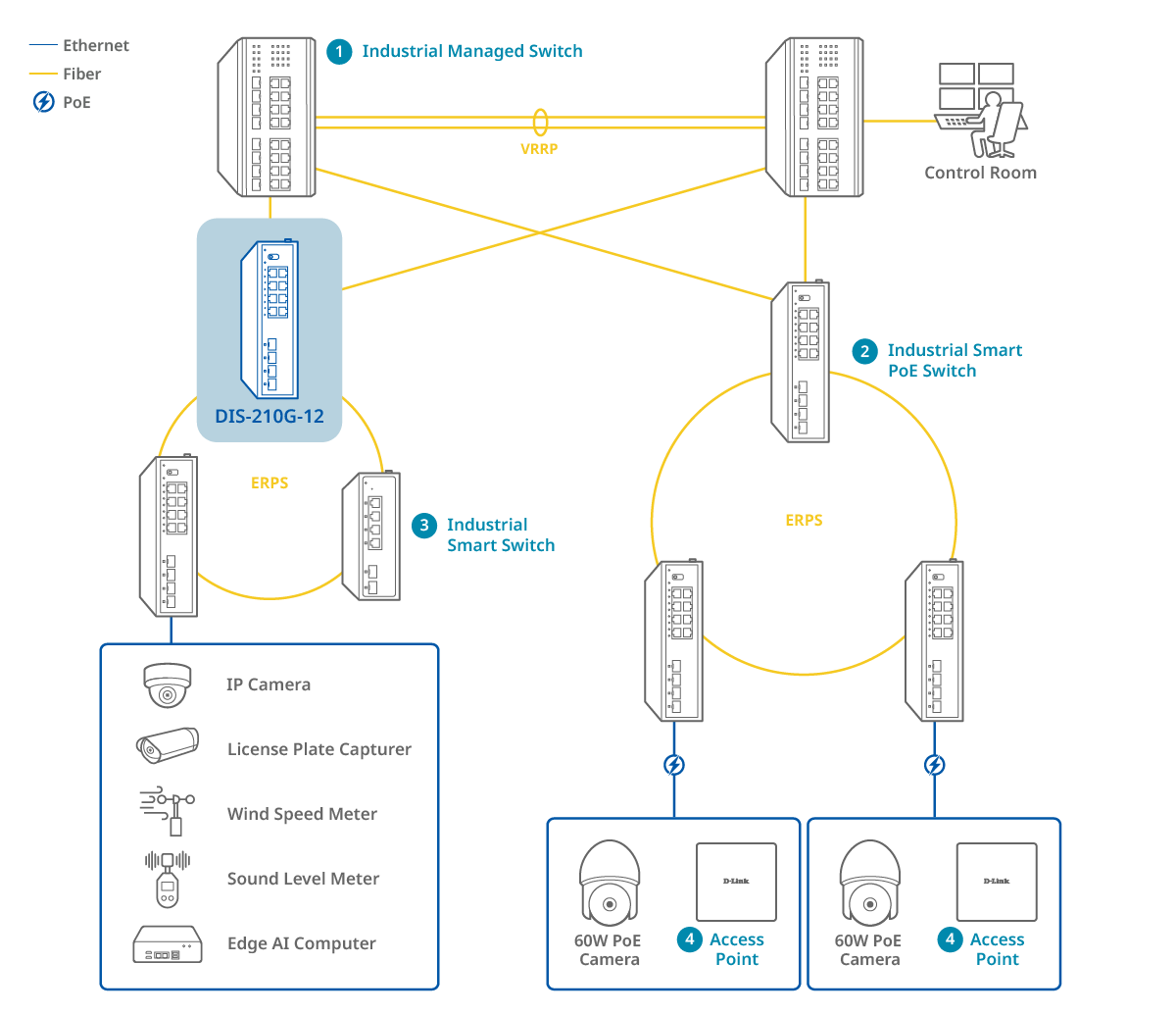 The DIS-210G-12 is an industrial smart switch equipped with eight 1G ports and four 1G SFP ports for network management and aggregation. The SFP ports support long-distance data transmission, rapid failover redundancy, and throughput aggregation. The DIS-210G-12 supports ERPS and static routing, which reduces latency, enables effective traffic control, and improves network scalability and efficiency.
