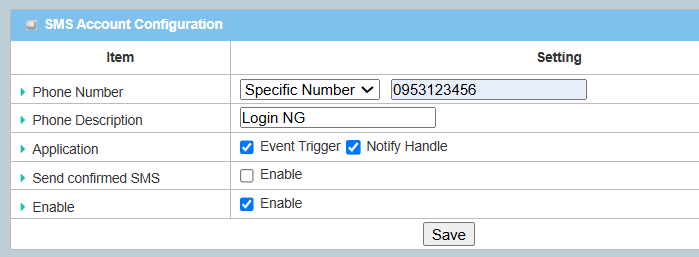 Let us take the DOM-530-TSO and a mobile phone as an example. When someone tries to log in to the device web GUI with an incorrect ID or password, the DOM-530-TSO will send an SMS message to the user.