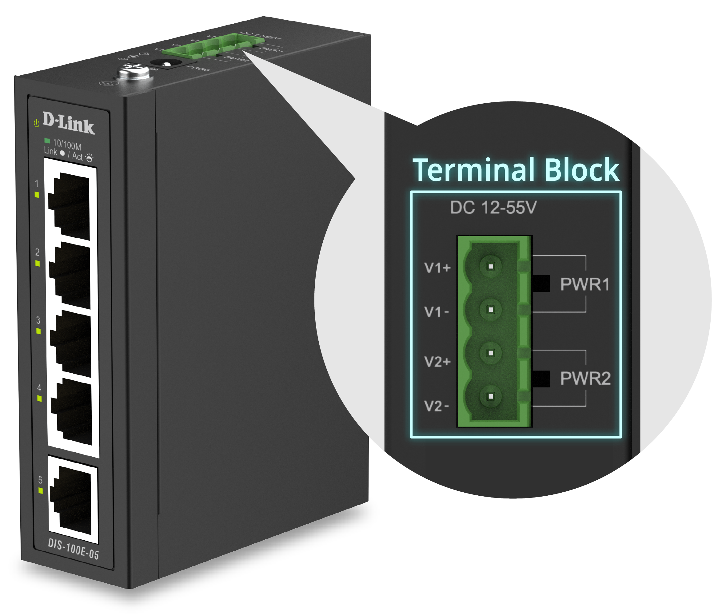 The DIS-100E-05 is equipped with dual power supply options. Each is capable of independently powering the device. This built-in redundancy ensures continuous operation even if one power source fails, minimizing shutdown risk and maintaining network performance. As industrial environments are common with unstable power conditions, its wide voltage range of 12 – 55V DC supports diverse power sources while protecting against surges and low voltage, delivering a stable and dependable power supply.