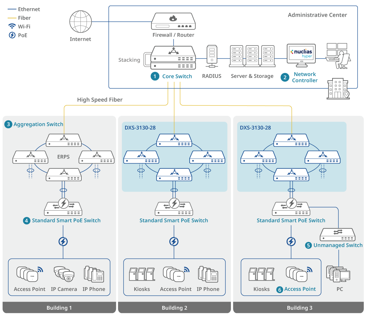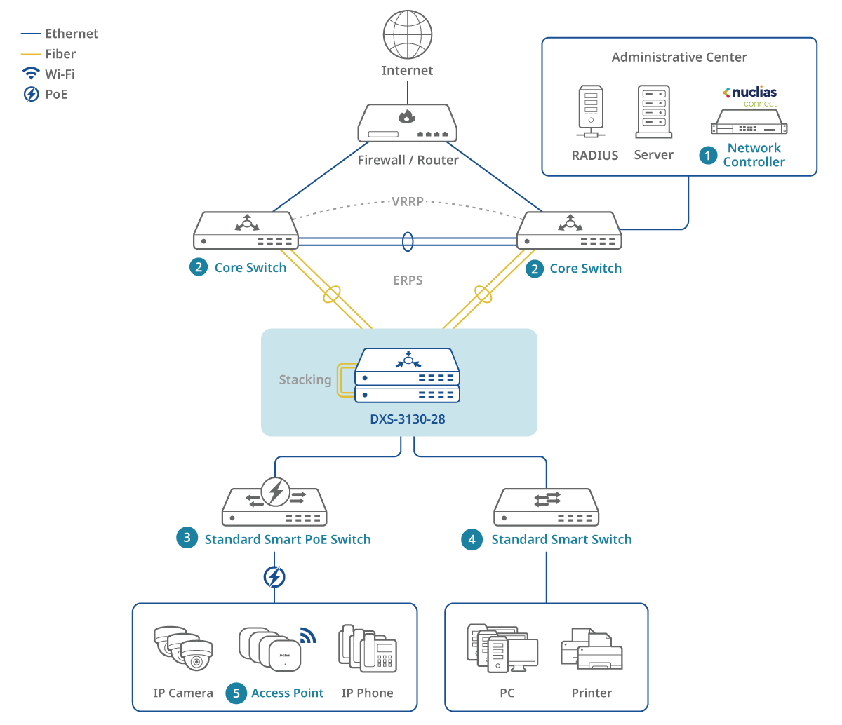 De DXS-3130-28 garandeert een continue uptime met redundante voeding en stacking. Het ERPS-herstel van 50 ms minimaliseert downtime, loopbackdetectie blokkeert poorten die door stormen worden getroffen en VRRP biedt naadloze back-uprouting, waardoor het ideaal is voor ziekenhuizen, fabrieken en andere missiekritische netwerken.
