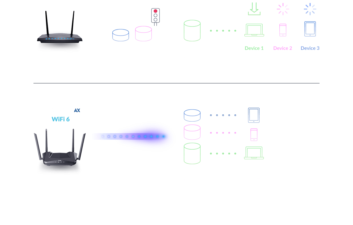 Wi-Fi 6 uses a combination of OFDMA and MU-MIMO technology to increase the total number of devices your network can effortlessly handle by up to 4x, so you can bring more of the latest tech into your smart home. And OFDMA transmits to multiple devices simultaneously to make sure everyone using the home Wi-Fi uses it with unprecedented efficiency.