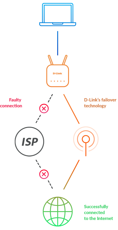 Nie pozwól, aby to Twój dostawca usług internetowych decydował, czy będziesz mógł być online. Routery LTE/4G i 5G D-Linka zbudowano z myślą o przełączaniu awaryjnym. To oznacza, że w przypadku awarii głównego łącza szerokopasmowego będziesz mógł się połączyć z Internetem przez łącze komórkowe.