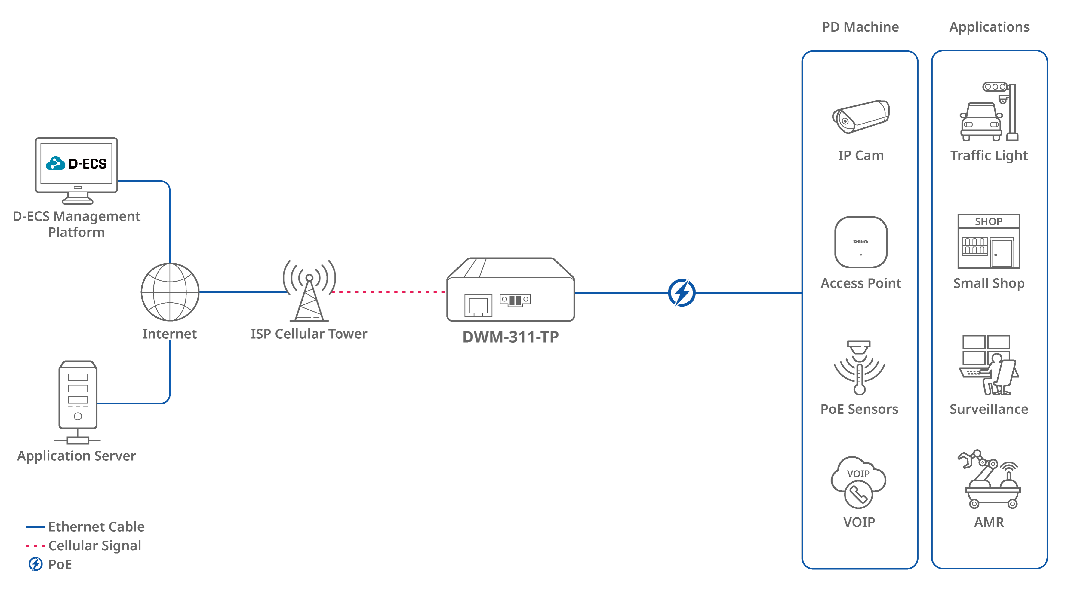 DWM-311-TP zapewnia stabilną łączność LTE i Ethernetową dla urządzeń PoE – Plug & Play bez zbędnych konfiguracji. Port Fast Ethernet z obsługą PoE (802.3af/at) umożliwia zasilanie kamer IP, punktów dostępowych, czujników PoE i systemów VoIP.
