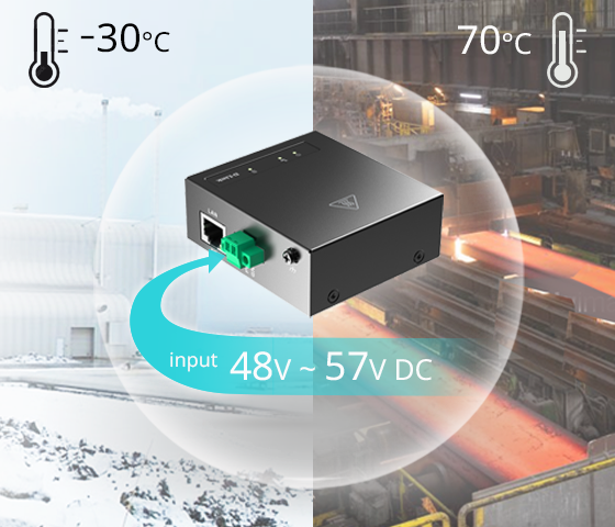 Obsługuje napięcie wejściowe 48–57 V DC, co zapewnia większą elastyczność przy doborze źródła zasilania i upraszcza instalację.