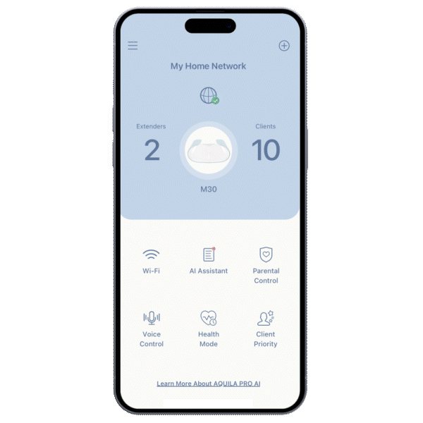 Dzięki aplikacji AQUILA PRO AI zarządzanie siecią to czysta przyjemność. Asystent AI zadba o monitorowanie wydajności i podpowie najlepsze rozwiązania. Twórz sieci Wi-Fi dla gości, aktywuj kontrolę rodzicielską, aby zadbać o bezpieczeństwo dzieci, lub zaplanuj automatyczne wyłączanie Wi-Fi w nocy dla spokojnego snu..