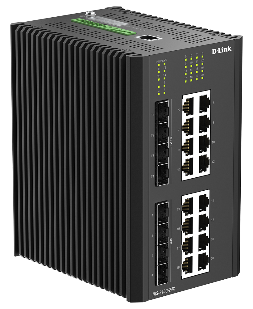The DIS-310G-24X is an industrial managed switch featuring sixteen 1GE ports, four 1G SFP ports, and four 10G SFP+ uplinks for high-performance aggregation and network backbone connectivity. The SFP interfaces support long-distance transmission, rapid failover, and high-capacity traffic aggregation, while built-in Layer 3 management with static and dynamic routing enables efficient traffic control and scalable network design.