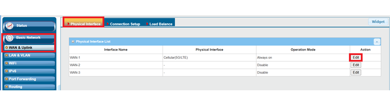 Go to Basic Network > WAN & Uplink > Physical Interface tab